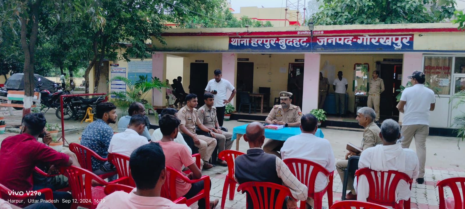 सहजनवा गोरखपुर। सहजनवां ब्लाक अंतर्गत हरपुर बुदहट थाना में पीस कमेटी की बैठक गुरुवार को थानाध्यक्ष विशाल सिंह की अध्यक्षता में हरपुर बुदहट थाना परिसर में सम्पन्न हुई। बैठक की अध्यक्षता करते हुए थानाध्यक्ष ने कहा कि वाराफात का त्यौहार और गणेश चतुर्थी का त्योहार शांति पूर्ण तरीके से मनाइए। हरपुर बुदहट पुलिस आपके साथ है।