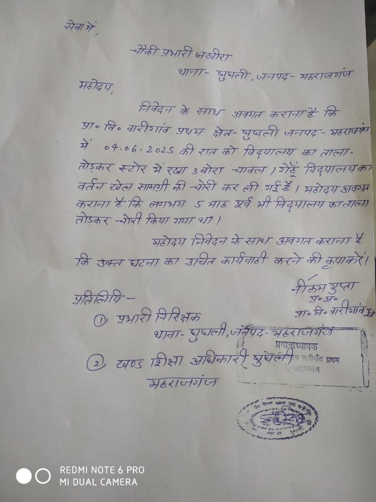 महराजगंज। घुघली विकास खण्ड के अन्तर्गत प्राथमिक विद्यालय बारीगांव प्रथम क्षेत्र – घुघली जनपद महराजगंज प्राथमिक विद्यालय ताला टुटा गेहूं चावल चोरी, जानकारी के अनुसार बारीगांव में बुधवार रात्रि में अज्ञात चोरों ने प्राथमिक विद्यालय का ताला तोड़कर गेहूं चावल उठा लेगए चोर,प्राथमिक विद्यालय के प्रधानाचार्य नीलम गुप्ता जखीरा चौकी पर तहरीर देकर बताएं कि स्टोर में रखा तीन बोरी चावल गेहूं बर्तन बच्चों का खेल सामग्री भी चोर उठा ले गए नीलम गुप्ता यह भी बताएं कि पांच माह पूर्व भी विद्यालय का ताला तोड़कर चोरी किया गया था इस संबंध में जखीरा चौकी प्रभारी धर्मेंद्र जैन ने बताया कि तहरीर मिली है जांच कर अज्ञात चोरों के खिलाफ कार्रवाई की जाएगी