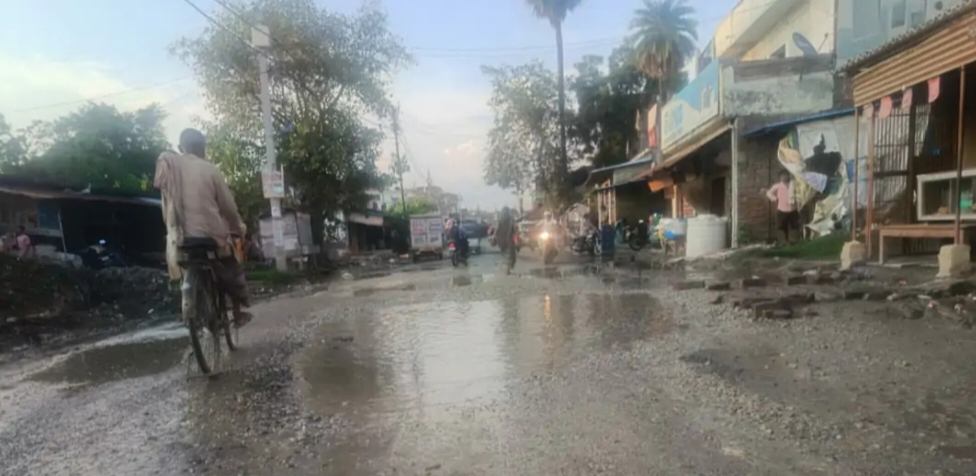 गड्ढों में समाया शिकारीगंज मार्ग बारिश में डूबा रास्ता घायल हो रहे वाहन चालक